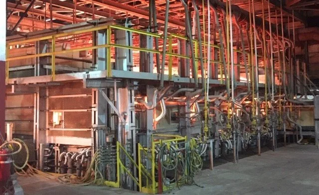 An unsealed melter crown lights up the factory.